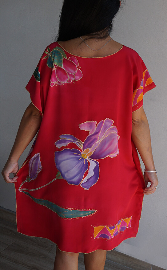 Für meine Produkte verwende ich 100% Ponge Seide, Seiden-Satin, Georgette, Crêpe de Chine und Crêpe Satin. Ausschließlich mit hochwertiger Seiden-Malfarbe oder Naturfarben bemalt. Dein Seidenprodukt möglichst von Hand waschen. Verwende eine milde Seife oder ein spezielles Seidenshampoo und lass es maximal fünf Minuten im lauwarmen Wasser einweichen. Der nasse Stoff ist sehr empfindlich und darf nur leicht hin und her bewegt werden. Keinesfalls auswringen! Die Seifenrückstände in 3 liter kaltem Wasser, mit einem Teelöffel Weinessig, ausspülen und zum Trocknen anschließend in ein Handtuch einrollen. Drück die Rolle sanft, roll sie aus und ziehe die Seide vorsichtig in Form. Den noch leicht feuchten Seidenstoff bei niedriger Temperatur - auf Links - bügeln. Achtung! Bitte kein Parfüm oder Deo auf Seidengewebe sprühen. Auch der Kontakt mit Bleiche führt zu Verfärbungen und Flecken. Ebenso empfindlich reagiert Seide auf Wasserflecken, starkes und direktes Sonnenlicht.
